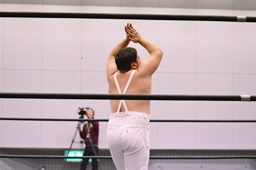 白鳥の舞が続く(右写真)。音楽止まると平田とYAZAWAがエルボー打ち合い。