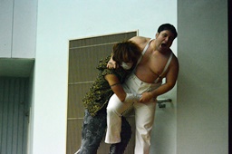 平田がYAZAWAのサスペンダーをYAZAWAの首に引っ掛ける、YAZAWA首が絞まる(左写真)、