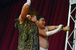 平田エルボー、YAZAWAは平田の手を取るとサスペンダーぱっちん攻撃(右写真)。