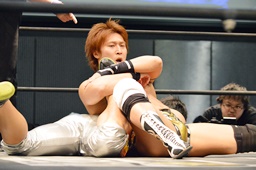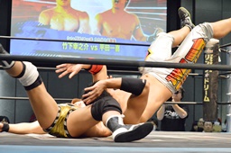 竹下ジャーマン狙う、平田丸め込む(左写真)、カウント2。