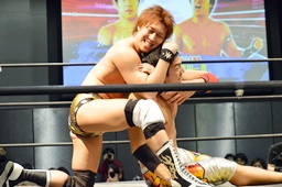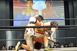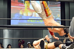 再度ロックアップ、竹下ヘッドロックからフライングメイヤー、平田ヘッドシザーズ、竹下フライングメイヤー、平田ヘッドシザーズでブレーク(左写真)。