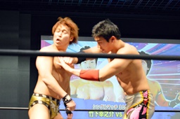 平田エースクラッシャー狙う、竹下ブロックして高速ドラゴンスープレックス(左写真)。10分経過。