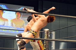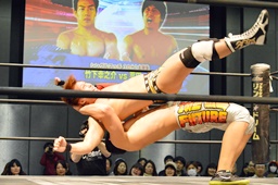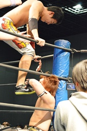 コーナーに上ってミサイルキック(右写真)、カウント2。