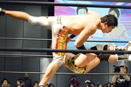 その場跳びムーンサルトプレス(左写真)、カウント2。