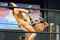 平田モンゴリアンチョップ連打、ロープに飛ぶ、竹下カウンターのゼロ戦キック(右写真)。