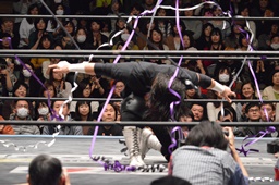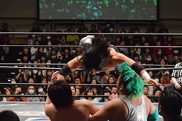 入江ロープに振る、宮武切り返してフライングバックエルボー(右写真)、佐々木にタッチ。