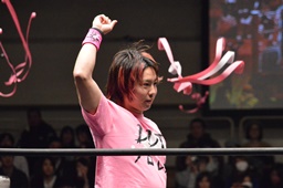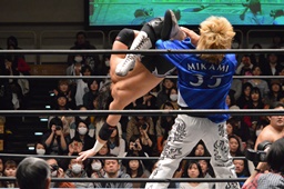 MIKAMIがスワンダイブのチョップで佐々木に先制攻撃(右写真)、試合開始。