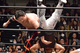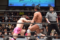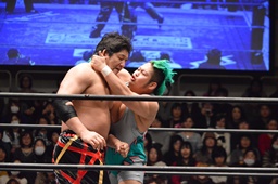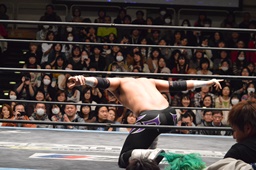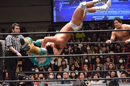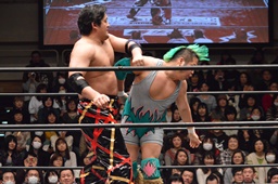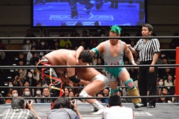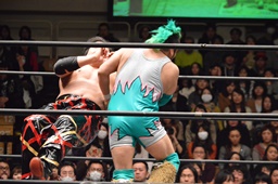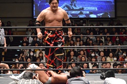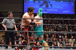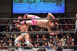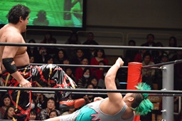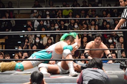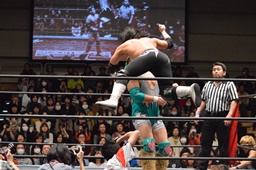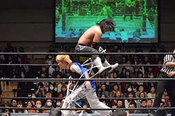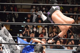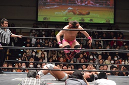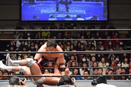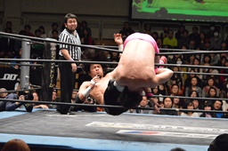 入江リングイン、宮武にボディスラム、ロープに飛んで曙式ボディプレス(左写真)、カウント2。