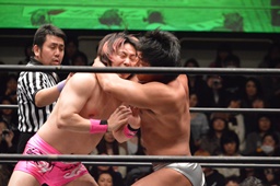 石川と入江がリングイン。ロックアップ、入江ヘッドロック、石川ロープに振る、ショルダーブロックの打ち合い(右写真)。
