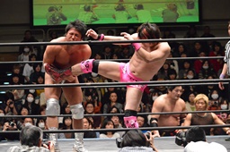 ひっくり返してムーンサルトプレスに行かせるが(左写真)、どう見ても連携というよりは石川がMIKAMIを道具に使ってるようにしか。石川カバー、カウント2。