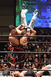 石川宮武にブレーンバスター、宮武ブロックして逆に投げようとするが上がらない(右写真)。