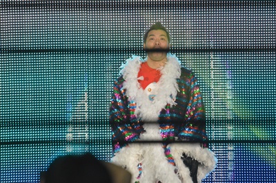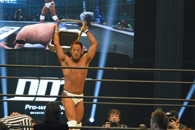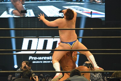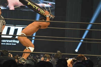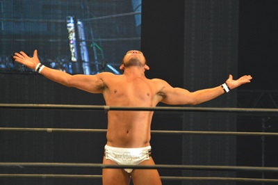 ディーノはビッグマッチ用のガウンを着て登場(右写真)。しかしすぐに脱いで客席に飛び込む。