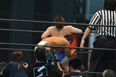 マイケルバックフリップ(左写真)、カウント2。10分経過。
