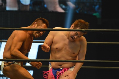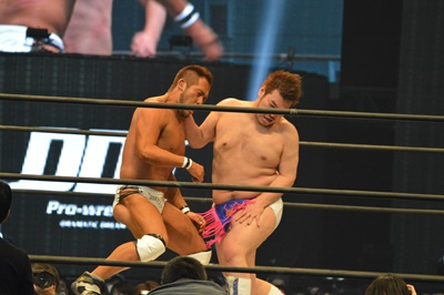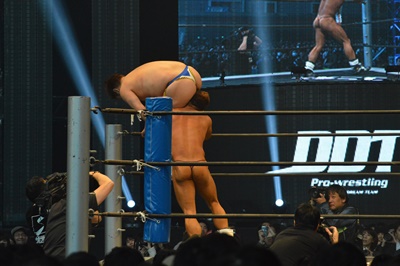 最後の一枚を脱ごうとするマイケル、松井レフェリー止める(左写真)。