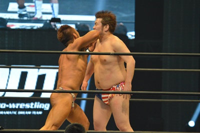 マイケルエルボー、ディーノはパンチ連打(左写真)。