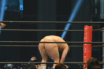タイツも脱いでTバック姿でエルボー(左写真)。