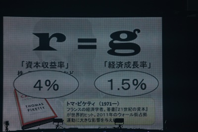 しかしピケティの研究によると数十年に渡り資本収益率は4%、経済成長率は1.5%(左写真)