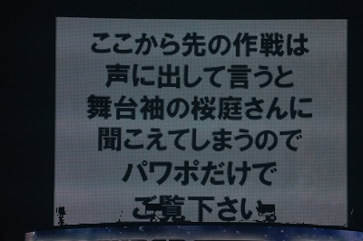 「ここから先の作戦は声に出して言うと舞台袖の桜庭さんに聞こえてしまうのでパワポだけでご覧下さい。」(右写真)