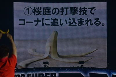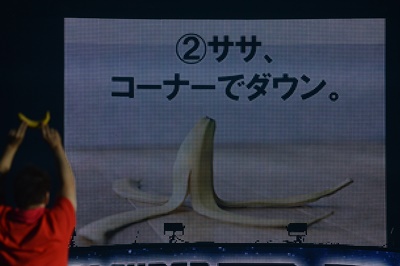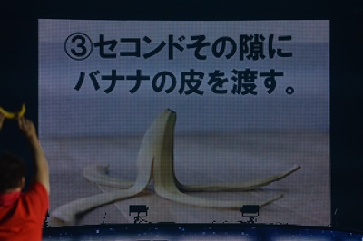 「Bセコンドがそのスキにバナナの皮を渡す。」(左写真)