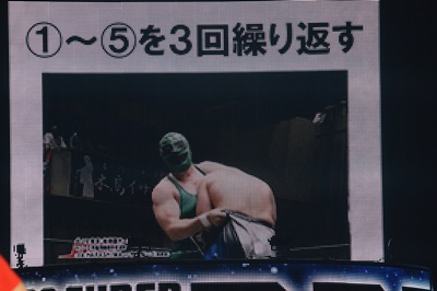 マッスルのオープニングテーマ「LONELY DAYS」を入場テーマにササダンゴ、藤岡、アントン、ディーノがマッスルトレインで入場(右写真)。泣かすなあ。