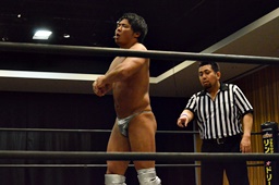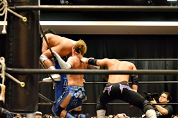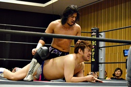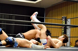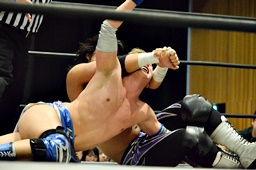 宮武ブレーンバスター(右写真)。宮武ロープに振る、ディーノ切り返す、宮武フライングバックエルボー、カウント2。