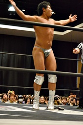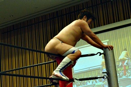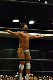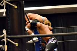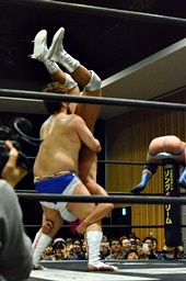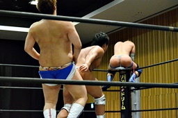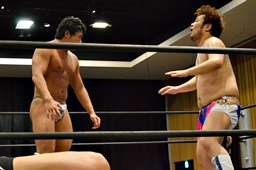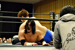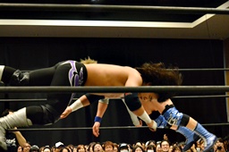 佐々木大石にケブラドーラ・コン・ヒーロ(左写真)、ディーノがロープに振る、佐々木切り返してドロップキック、宮武にタッチ。5分経過。