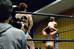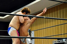 先発は大石と宮武。ロックアップ、大石ヘッドロック、宮武切り返す、大石ロープに振る、宮武ショルダーブロック。宮武腕を取る、大石切り返す(左写真)。両軍タッチ。