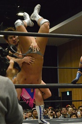 ゴッチ式にスイッチ(左写真)、マットに突き刺して漢固めでカウント3。