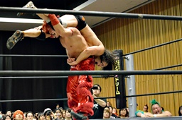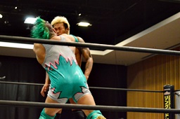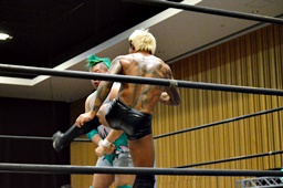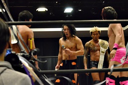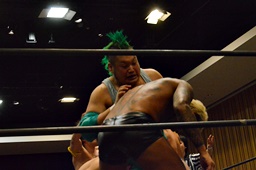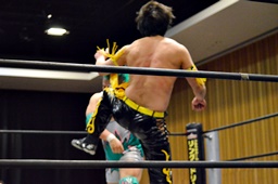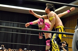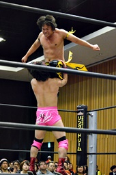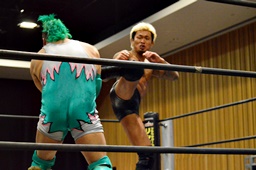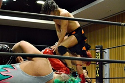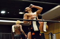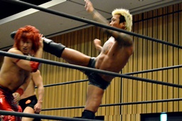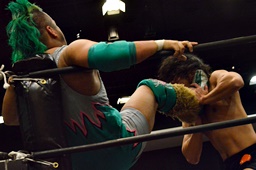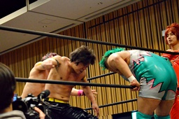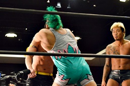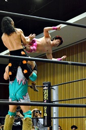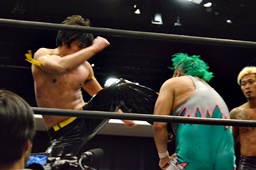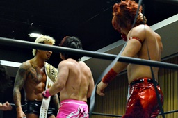 坂口入ってキック、入江坂口の背中にパンチ(左写真)。坂口KUDOにタッチ。石井と高尾はKUDOをエプロンに出してサンドイッチドロップキック、リングに戻す。高尾エルボー連打、ロープに振ってドロップキック、石井にタッチ。