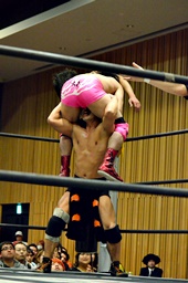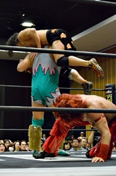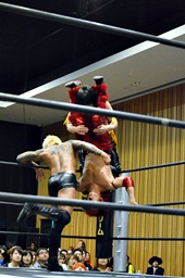 高尾がKUDOに倒立式フランケンシュタイナー狙う、坂口が腹パンで阻止(右写真)。