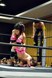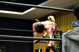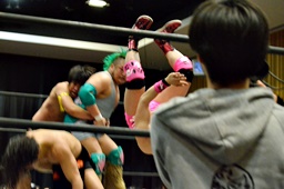 高梨ストンピング、ヘアホイップ狙うが入江ブロックして投げる。高梨鼻つまんでチョップ、ドロップキック、KUDOにタッチ。KUDO首投げからサッカーボールキック。コーナーに詰めてヒザ蹴り(右写真)。