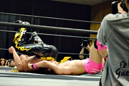 アームロック(左写真)、入江ロープ。坂口は高梨にタッチ。5分経過。
