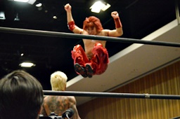 KUDOコーナーに上る、石井も上る、高梨が石井を捕まえてパワーボム狙う(右写真)、