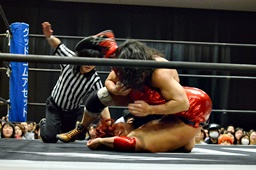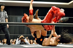 KUDOコーナーに振って突っ込む、入江カウンターのキック、KUDOキャッチ(左写真)。KUDOその足をロープに引っ掛けるとネックブリーカードロップ、ダブルニードロップ。