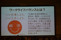 ワークライフバランスとは「仕事と生活の調和」と訳され、国民一人ひとりがやりがいや、充実感をもちながら働き仕事上の責任を果たしながら、子育て期やプロレス期といった人生の各段階において多様な生き方の選択ができることを指します。(左写真)