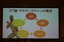37歳・スーパーササダンゴマシンの場合「金型」「家庭」「大学院」「ローカルタレント」「ローカルレスラー」の5要素のバランス(右写真)。