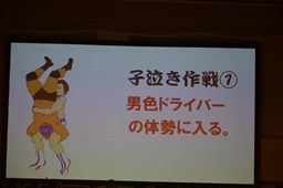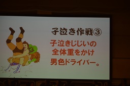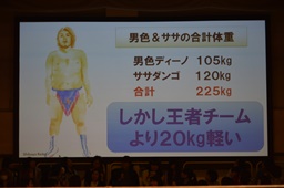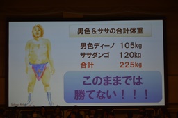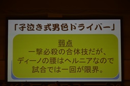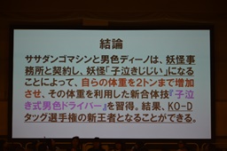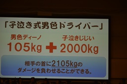 結論「ササダンゴマシンと男色ディーノは妖怪事務所と契約し、妖怪『子泣きじじい』になることによって、自らの体重を2トンまで増加させ、その体重を利用した新必殺技『子泣き式男色ドライバー』を習得。結果、KO-Dタッグ選手権の新王者となることができる。」(右写真)