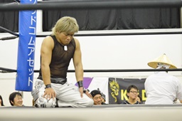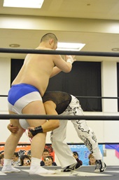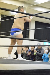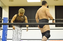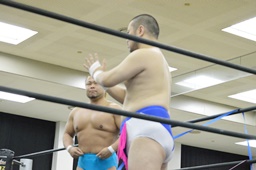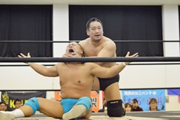 ロックアップ、MIKAMIヘッドロック、松永ロープに振ってロープワークからエルボー(左写真)。志度ロープワーク、MIKAMIコルバタ、高木にタッチ。