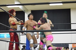 ボディスラムからテディベア(左写真)、佐々木がカット。入江は高尾にタッチ。