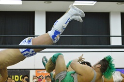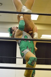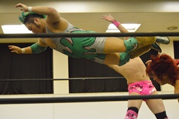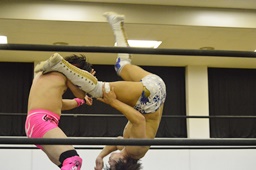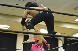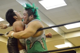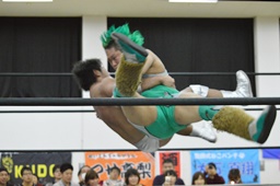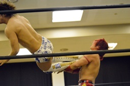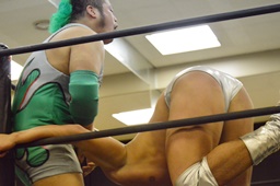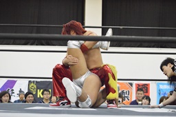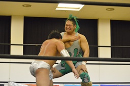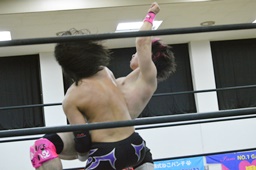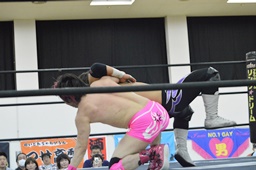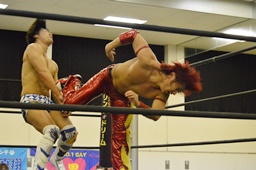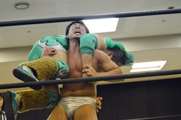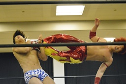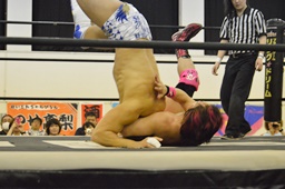 高尾ボディスラム、カウント2。片逆エビ固め(右写真)、宮武ロープ。