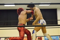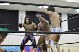 佐々木ドロップキック(右写真)。宮武と入江にタッチ。