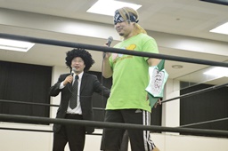 梅田が先に入場(右写真)。後から入場したアントンは「コール・ミー・アントン!コール・ミー・スネーク!」と叫び、観客で来てた留学生たちの支持を取り付けることに成功。