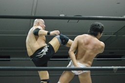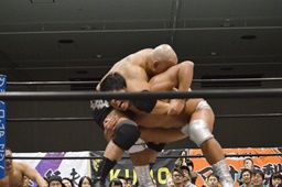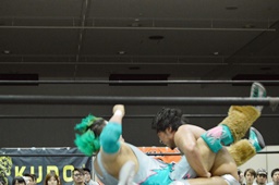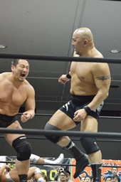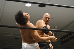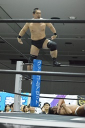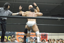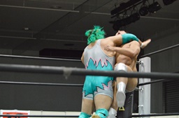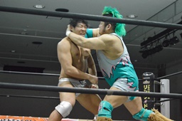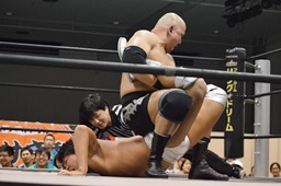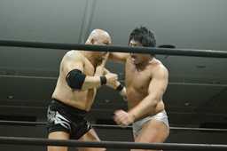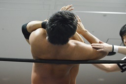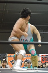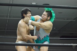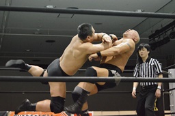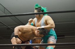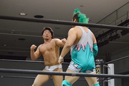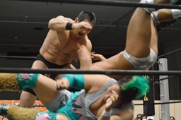 相島ヘッドロック(左写真)、宮武ロープに振ろうとするが相島振らせない。宮武なんとかロープに振るが相島ショルダーブロックで吹っ飛ばす。ボディスラム、カウント2。入江にタッチ。