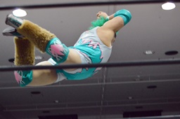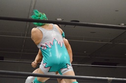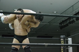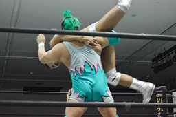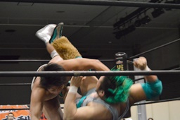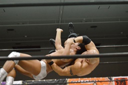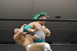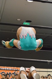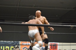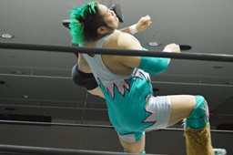 入江と相島串刺しエルボー連発、相島がボディスラム、入江コーナーに上ってフライングソーセージ(左写真)、カウント2。入江ロープの間を走ってビーストボンバー、カウント3。