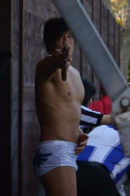 佐々木と飯伏も水辺に(左写真)。飯伏は銃を持ったまま入ろうとして怒られる。