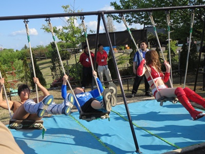 飯伏、大石、赤井が3人でブランコ(左写真)。