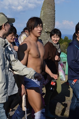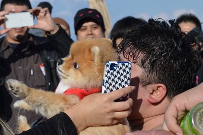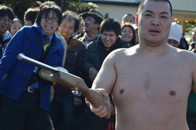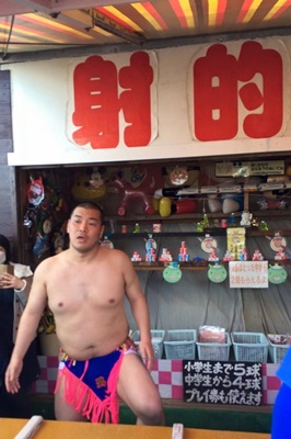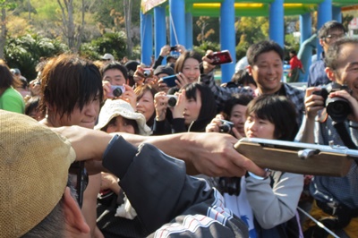 ファンに囲まれて移動開始。手には射的のライフル銃(右写真)。
