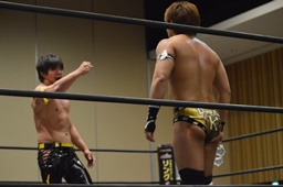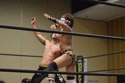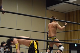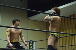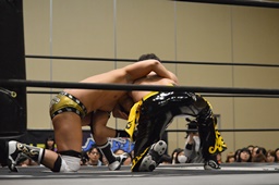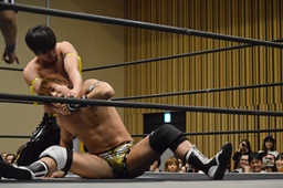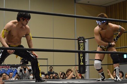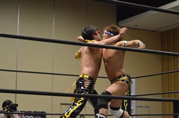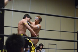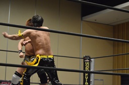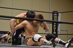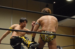 KUDOヘッドロック、平田はエルボー(左写真)、ロープに振る、KUDOショルダーブロック。