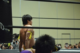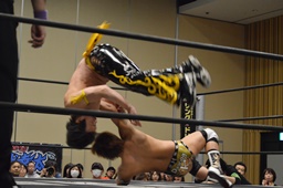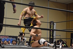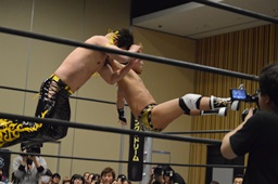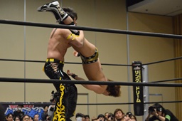 KUDOロープに飛ぶ、平田リープフロッグからアームホイップ2連発(右写真)、