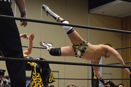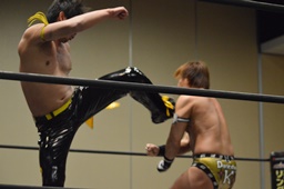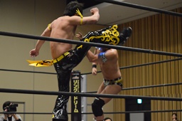KUDOミドルキック(左写真)、KUDOボディスラムから倒立式ダブルニードロップ、カウント2。